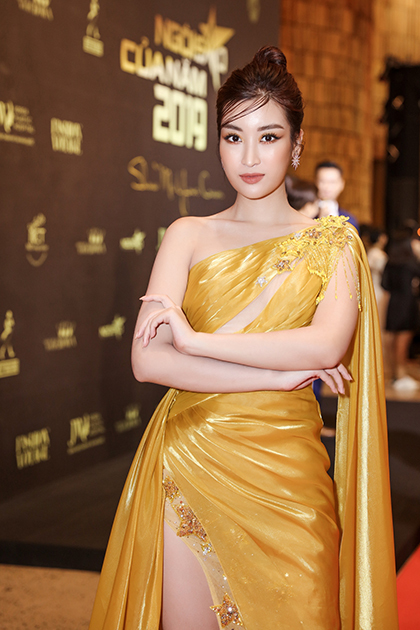 Hoa hậu Việt Nam 2016 Đỗ Mỹ Linh mặc đầm dạ hội lệch vai với màu vàng hoàng gia.