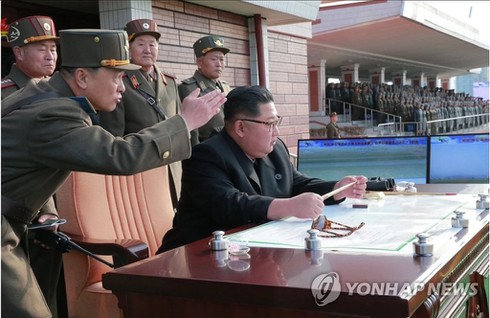 Chủ tịch Triều Tiên Kim Jong-un giám sát cuộc tập trận tại sân bay Wonsan-Kalma hồi tháng 11/2019. (Ảnh: Yonhap)
