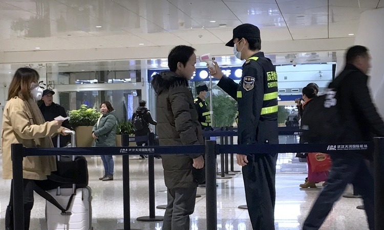 Kiểm tra thân nhiệt tại sân bay quốc tế Vũ Hán Vũ Hà. Ảnh: AP.
