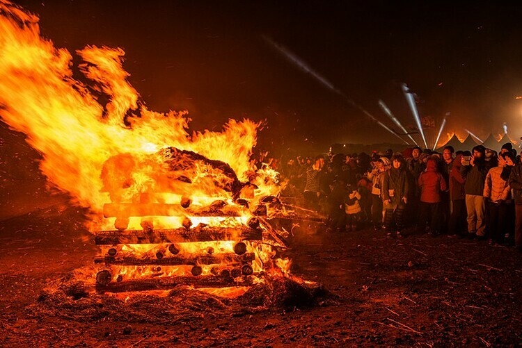 Điểm nổi bật trong lễ hội là đốt cháy "ngôi nhà trăng" được dựng từ cây thông và một số loại gỗ khác. Ảnh: Jeju Tourism Organization.