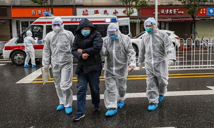 Nhân viên y tế mặc đồ bảo hộ trắng đưa bệnh nhân (áo khoác đen) vào bệnh viện tại Vũ Hán ngày 26/1. Ảnh: AFP.