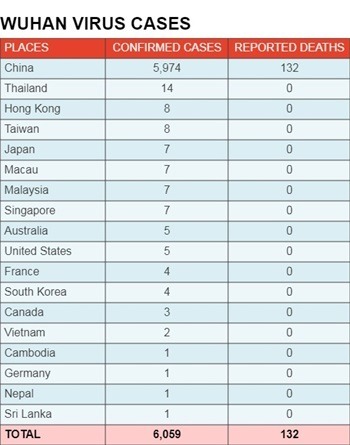Ủy ban Y tế Quốc gia Trung Quốc hôm nay xác nhận số trường hợp nhiễm viêm phổi do virus nCoV tăng thêm 1.459, nâng tổng số người nhiễm bệnh lên gần 6.000. Ủy ban cũng cho biết đã có thêm 26 người chết tính đến cuối ngày 28/1, nâng số nạn nhân thiệt mạng vì dịch viêm phổi Vũ Hán lên 132 người.