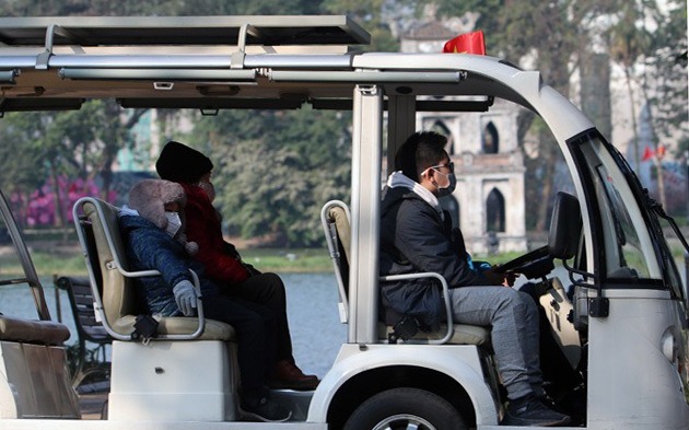 Du khách đeo khẩu trang khi tham quan quanh Hồ Gươm bằng xe điện sáng 30/1. Ảnh: Võ Hải.