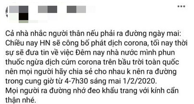 “Chiều nay Hà Nội sẽ công bố phát dịch corona, tối nay thời sự sẽ đưa tin về việc đêm nay nhà nước mình phun thuốc ngừa dịch cúm corona trên bầu trời toàn quốc nên mọi người hãy chia sẻ cho nhau không nên ra đường trong cung giờ từ 4-7h30 sáng mai 1/2/2020” - đây là nội dung được chia sẻ tràn lan trên mạng xã hội Facebook chiều ngày 31/1.