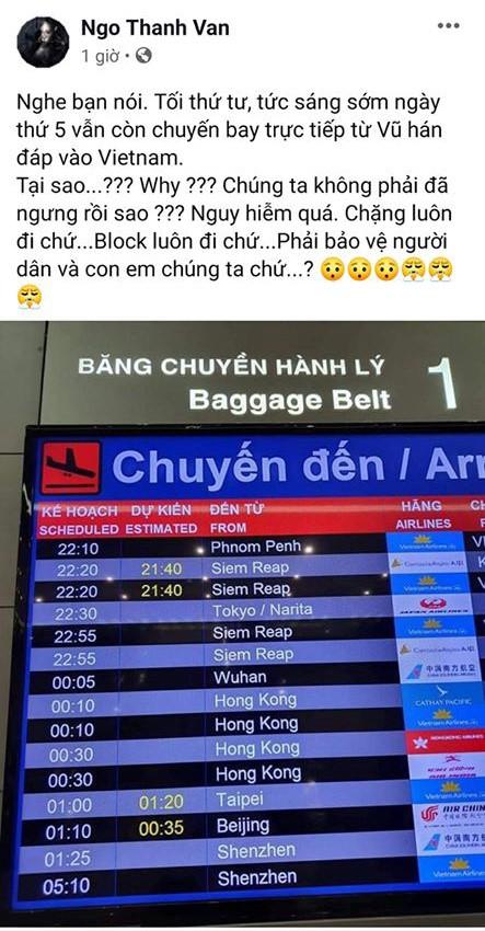 Liên quan đến dịch viêm phổi Vũ Hán, sáng 31.1 Ngô Thanh Vân đã lên trang cá nhân đăng tải thông tin hãng hàng không vẫn duy trì các chuyến bay từ Vũ Hán về Việt Nam. Tuy nhiên thông tin này không chính xác vì vào thời điểm này Cục hàng không đã dừng cấp phép các chuyến bay hai chiều các chuyến bay Việt Nam - Vũ Hán.