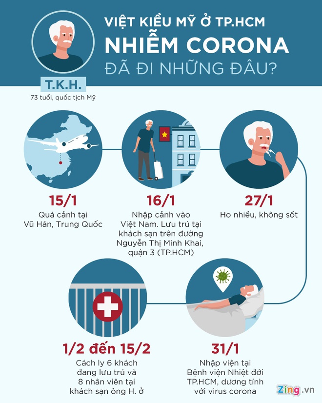 Trước đó, ngày 31/1, Bệnh viện Bệnh nhiệt đới TP.HCM điều trị cho bệnh nhân dương tính với virus corona. Đó là ông T.H.K., sinh năm 1947, quốc tịch Mỹ. Trước khi nhập viện, người này lưu trú tại phòng 202 khách sạn Triều Hân, 382/1-3 Nguyễn Thị Minh Khai, phường 5, quận 3, TP.HCM.