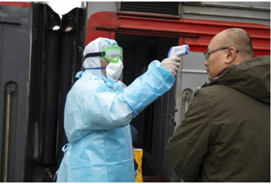Một nhân viên y tế đo thân nhiệt cho hành khách Trung Quốc ở Matxcơva. (Ảnh: AP)