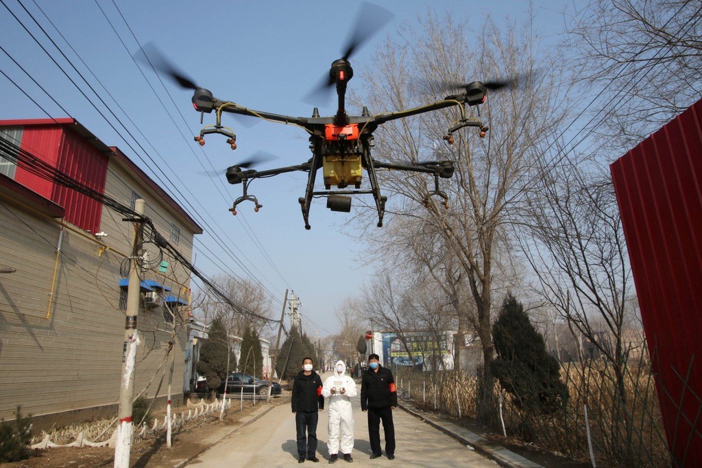 Một tình nguyện viên trong bộ đồ bảo hộ điều khiển máy bay không người lái phun thuốc khử trùng tại làng Zhengwan ở Handan, tỉnh Hồ Bắc, để đối phó với sự bùng phát của virus corona. Ảnh: Reuters.