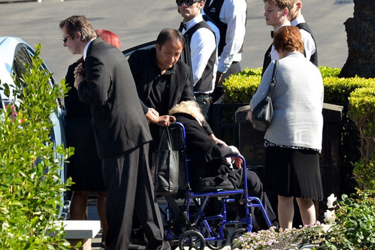 Diễn viên Cameron Douglas (áo trắng) cùng bạn gái Viviane Thibes (trái) ở đám tang ông nội. Anh là con trai diễn viên Michael Douglas, nối nghiệp diễn xuất của cha và ông.