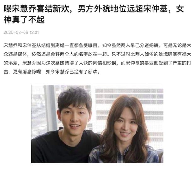 Bài viết của trang Sohu khá dài với 3/4 nội dung nhắc về chuyện cũ giữa cặp đôi Song Song. Tuy nhiên, ở đoạn kết bài, Sohu viết, có 1 hãng truyền thông tiết lộ Song Hye Kyo đã có tình mới. Đối phương không những có ngoại hình tuấn tú mà gia thế còn thuộc hàng "không phải dạng vừa đâu". Nguồn tin cho biết, bạn trai mới của Song Hye Kyo là một đại gia người Hong Kong.