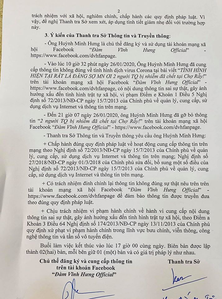 Trên Fanpage chính thức, Đàm Vĩnh Hưng chia sẻ ảnh chụp biên bản làm việc với Sở Thông tin và Truyền thông TP.HCM vào ngày 6/2 vì đưa thông tin sai về dịch virus Corona. Mr. Đàm thừa nhận lỗi sai vì đã đăng tải thông tin chưa được kiểm chứng, do sự hấp tấp cũng như lo lắng về tình hình dịch bệnh ngày càng nghiêm trọng.
