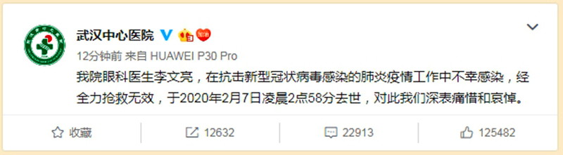 Tuy nhiên, theo tin tức mới nhất từ Weibo chính thức của Bệnh viện Trung ương Vũ Hán lúc 3 giờ 48 phút ngày 7/2: Bác sĩ nhãn khoa Vũ Hán Lý Văn Lượng đã qua đời lúc 2 giờ 58 phút ngày 7/2.