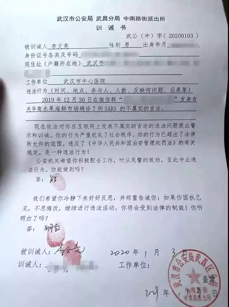 Anh nhắc nhở bạn học chú ý đề phòng. Sau khi tin nhắn được lan truyền trên Weibo, Cục Công an địa phương bắt giữ anh vào ngày 3/1/2020 và cáo buộc anh đã đăng “phát ngôn sai sự thật”, cảnh báo, phê bình, đồng thời yêu cầu anh ký “bản kiểm điểm”.