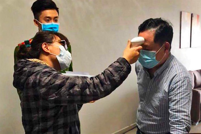 Cán bộ y tế phường Mộ Lao kiểm tra thân nhiệt người bị cách ly dưới sự giám sát của công an. Ảnh: Nhân vật cung cấp