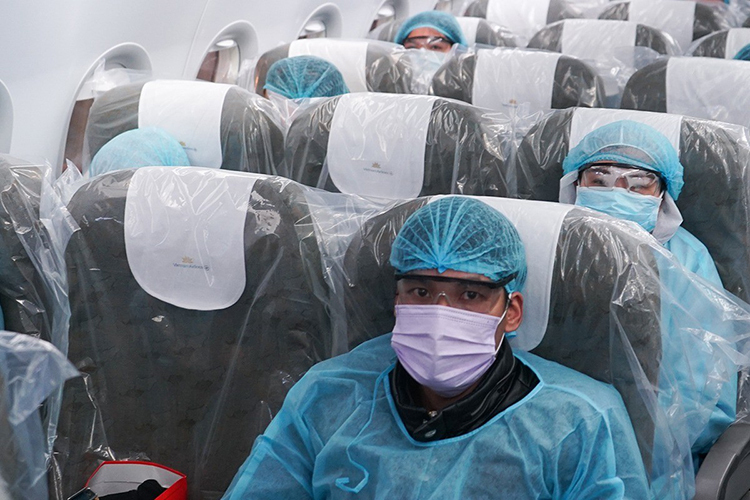 Những người Việt ở Vũ Hán trên chuyến bay về nước sáng 10/2. Ảnh: Vietnam Airlines