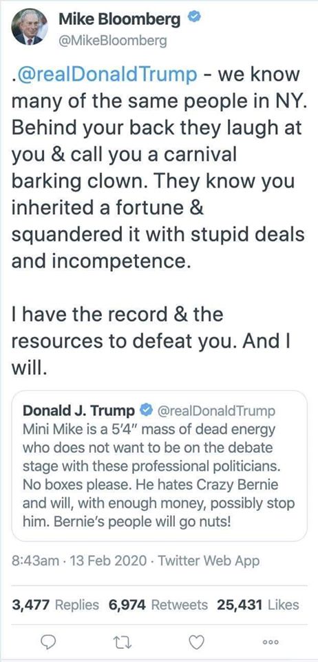 Khẩu chiến giữa hai ông Donald Trump và ông Mike Bloomberg đang nóng lên trên Twitter, sau khi Tổng thống Donald Trump gọi tỉ phú Mike Bloomberg là "kẻ thua cuộc". Tỉ phú Bloomberg bèn quật lại, gọi ông Trump là "gã hề".