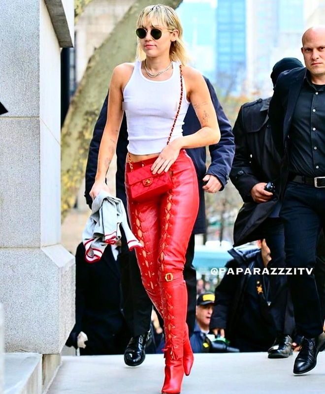 Mới đây, Miley Cyrus đã xuất hiện trên đường phố Manhattan, New York để tham dự show diễn thời trang của Marc Jacob. Trong khi những ngôi sao khác đều trung thành với phong cách thời trang an toàn, giọng ca "Wrecking Ball" đã thể hiện cá tính nổi loạn của mình khi quyết định "thả rông" với chiếc áo tanktop trắng và quần da đan dây đỏ nổi bần bật.
