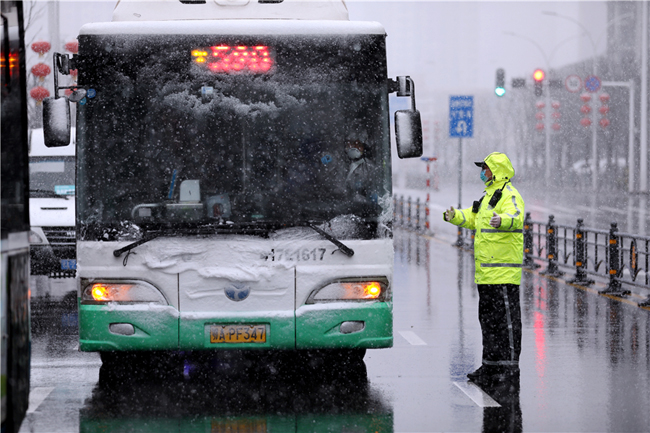 Lực lượng công an, cảnh sát tại Vũ Hán làm việc dưới tuyết trắng xóa. Ảnh: Tân Hoa Xã.