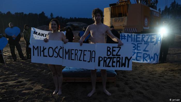 Ba Lan đang bắt tay vào xây dựng một kênh đào ở phía Bắc đất nước được gắn cờ EU làm dấy lên lo ngại nó có thể hủy hoại môi trường. “Sự nhạy cảm là phản ứng của chúng tôi đối với hành động phi pháp này”, Wojciechowicz nằm khỏa thân bên bạn trai cũng là nhà hoạt động Rudolf Robak, nói. Cả hai muốn truyền đi thông điệp về nâng cao nhận thức toàn cầu về tác động môi trường của kênh đào.