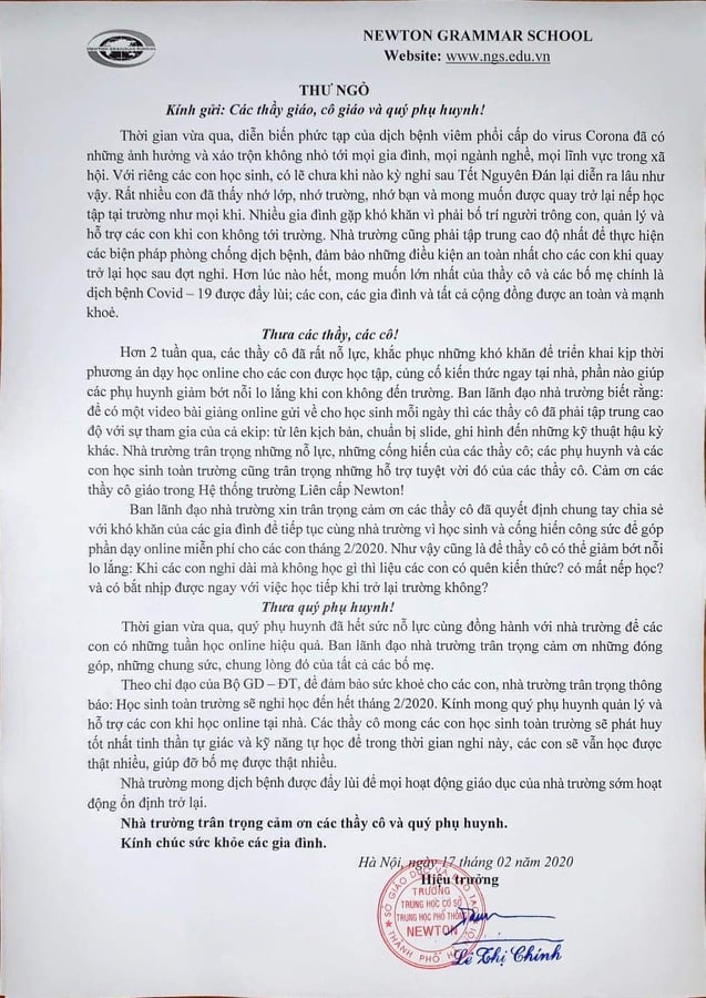Trước phản ứng gay gắt của phụ huynh, ngay đêm 17/2, Trường liên cấp Newton đã phát đi thông báo mới nhất là các giáo viên của nhà trường quyết định vẫn dạy trực tuyến cho học sinh nhưng phụ huynh không phải đóng khoản phí nào.