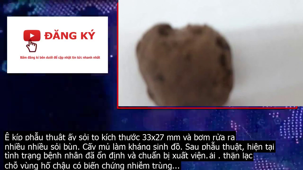 Ê-kíp phẫu thuật ấy sỏi to kích thước 33x27 mm và bơm rửa ra nhiều nhiều sỏi bùn. Cấy mủ làm kháng sinh đồ. Sau phẫu thuật, hiện tại tình trạng bệnh nhân đã ổn định và chuẩn bị xuất viện.