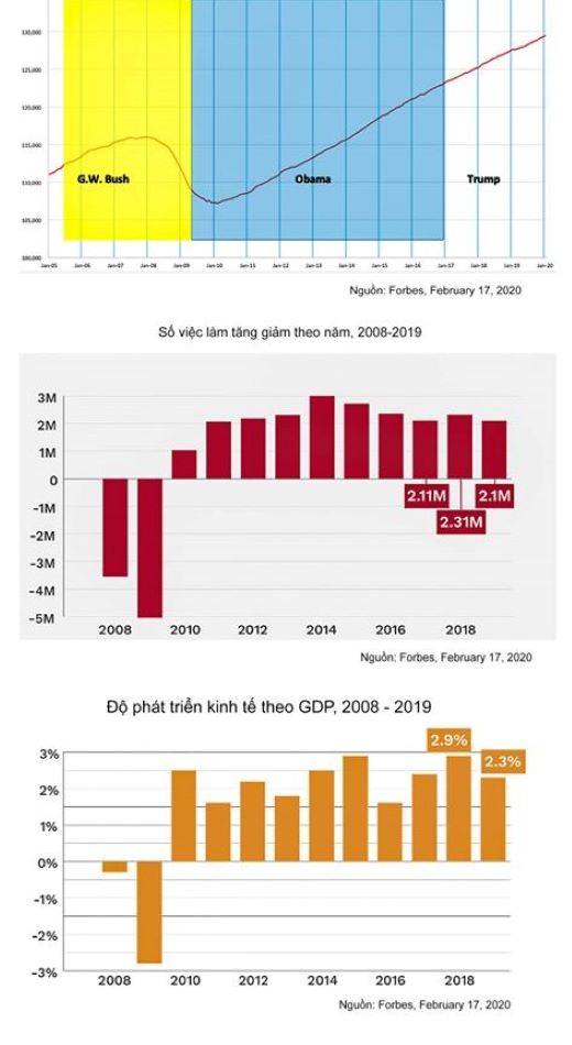 “Tổng thống đảo ngược mọi chính sách kinh tế thất bại dưới thời Obama, và nhờ vậy, đảo ngược nền kinh tế loạng choạng của Obama/Biden,” Phát ngôn nhân chiến dịch tranh cử, Kayleigh McEnany ghi. “Obama và Biden sắp đặt phục hồi kinh tế tồi tệ nhất trong lịch sử hiện đại.”