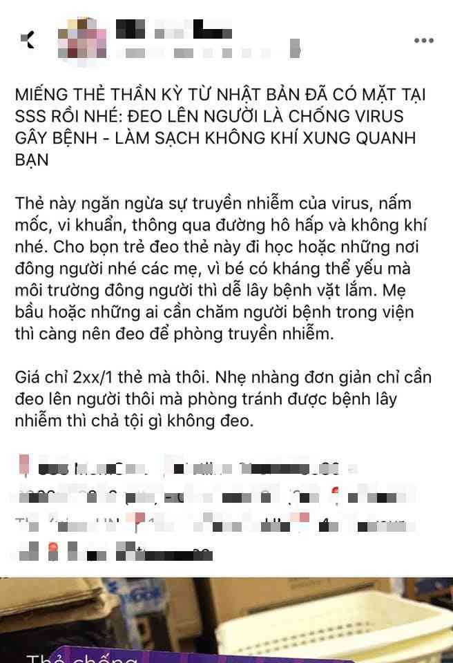 Tấm thẻ này đang được quảng cáo rất nhiều về tác dụng đẩy lùi Covid-19. Hiện nay trên mạng xã hội, có nhiều người rao bán các loại thẻ để phòng dịch Covid-19. Thậm chí, người bán cho rằng những chiếc thẻ này giống như tấm bùa hộ mệnh, giúp đánh bay 99% virus.