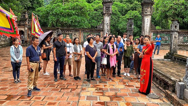 Du khách Việt thăm quan đi tích lịch sử trong quần thể danh thắng Tràng An. (Ảnh: Xuân Mai/Vietnam+)