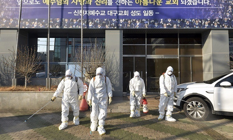 Nhân viên y tế tẩy trùng phía trước nhà thờ giáo phái Tân Thiên Địa ở Daegu, Hàn Quốc hôm 19/2. Ảnh: AP.