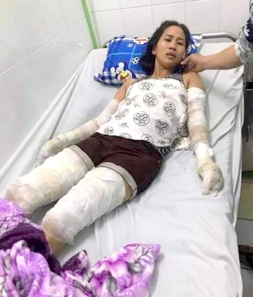 Chị Đông bị bỏng chân, tay khi lao vào ôm con. Ảnh: Hắc Minh.