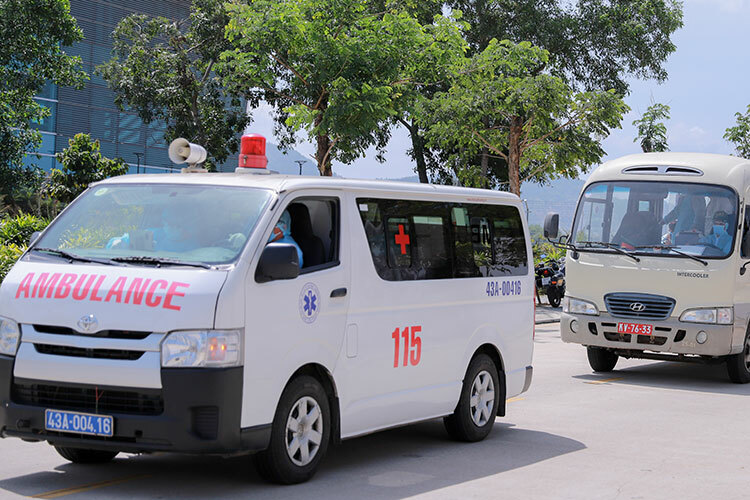 Xe cứu thương đưa hành khách bị sốt trên chuyến bay từ Daegu về thẳng Bệnh viện Phổi để cách ly, trưa 24/2. Ảnh: Nguyễn Đông.