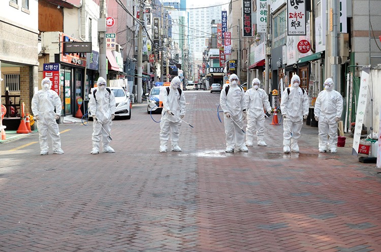 Nhân viên thành phố Daegu khử trùng một khu vực có bệnh nhân nhiễm nCoV. Ảnh: Yonhap