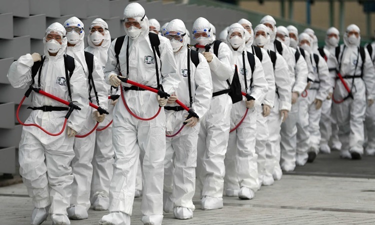 Binh sĩ Hàn Quốc mặc đồ bảo hộ phun thuốc khử trùng tại một ga tàu ở Daegu hôm 29/2. Ảnh: AFP.