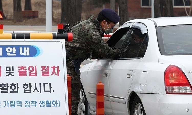 Binh sĩ Hàn Quốc kiểm tra nhiệt độ tại cổng vào cơ sở không quân ở Gyeryongdae, tỉnh Nam Chungcheong. Ảnh: Yonhap.