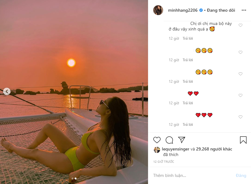 Trên Instagram cá nhân, Minh Hằng mới đăng tải h́nh ảnh diện áo tắm trong chuyến du lịch Phú Quốc với chú thích: "Em ngâm ḿnh trong làn nước để mặn ṃi từ da dẻ". Người đẹp diện retro bikini với thiết kế truyền thống, đơn giản. Bài đăng của Minh Hằng hiện nhận được gần 30000 lượt thích cùng hơn 100 b́nh luận. Cư dân mạng dành nhiều lời khen cho ngoại h́nh xinh đẹp cùng vóc dáng chuẩn đẹp của Minh Hằng, thậm chí có fan c̣n hỏi Minh Hằng: "Chị ơi chị mua bộ này ở đâu xinh quá vậy ạ".