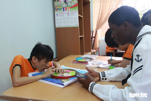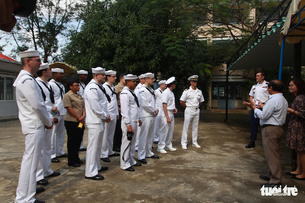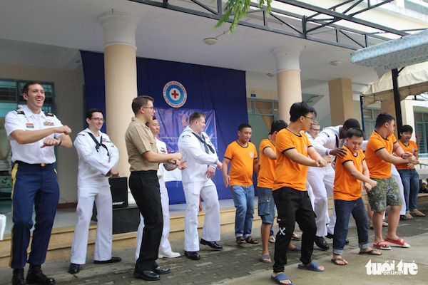 Chiều 5-3, gần 30 thủy thủ nhóm tác chiến tàu sân bay USS Theodore Roosevelt đã đến thăm và giao lưu với các em nhỏ khuyết tật ở Trung tâm hướng nghiệp Hội chữ tập đỏ Đà Nẵng.