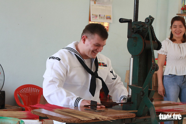 Một lính hải quân Mỹ hào hứng khi sản phẩm nhang mình tự làm sắp hoàn thành - Ảnh: ĐOÀN NHẠN
