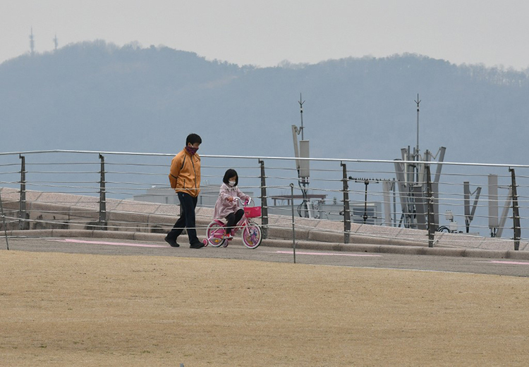 Một ông bố đưa con đi đạp xe ở công viên tại thành phố Daegu hôm 28/2. Ảnh: AFP