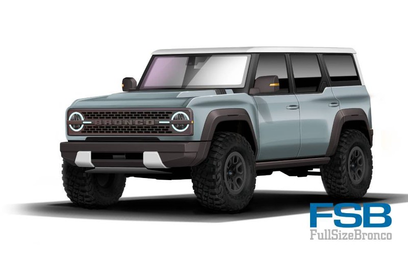 Các CGI mô tả Ford Bronco với thiết kế hình hộp và phần đầu xe có lưới tản nhiệt màu đen cỡ lớn kết hợp với huy hiệu và đèn pha tròn 'Bronco'. Ngoài ra, chiếc off-road được trang bị với cản màu đen mờ và vòm bánh xe loe cũng như bộ mâm xe 5 chấu chắc chắn và lốp xe địa hình.