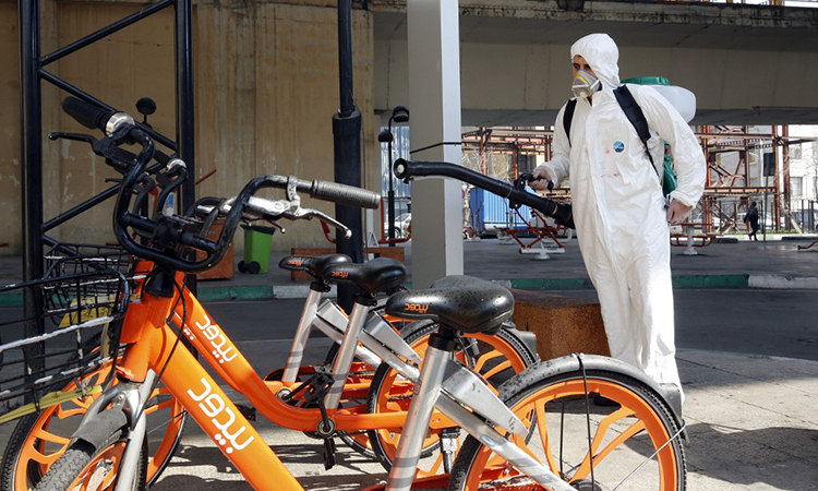 Lính cứu hỏa Iran phun hóa chất tẩy trùng ở khu vực công cộng tại thủ đô Tehran ngày 5/3. Ảnh: AFP.