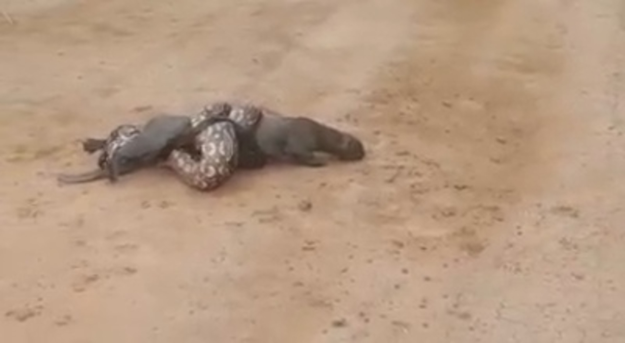 Nhân viên kiểm lâm Sole Rojas và người bạn của anh đã ghi lại cảnh tượng trăn Nam Mỹ siết chặt mèo rừng ở đường tại trấn Las Lajitas, tây bắc Argentina.