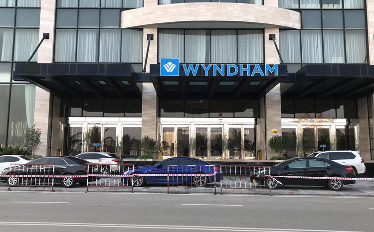 Nhà chức trách dựng barie phong tỏa khách sạn Wyndham. Ảnh: Minh Cương