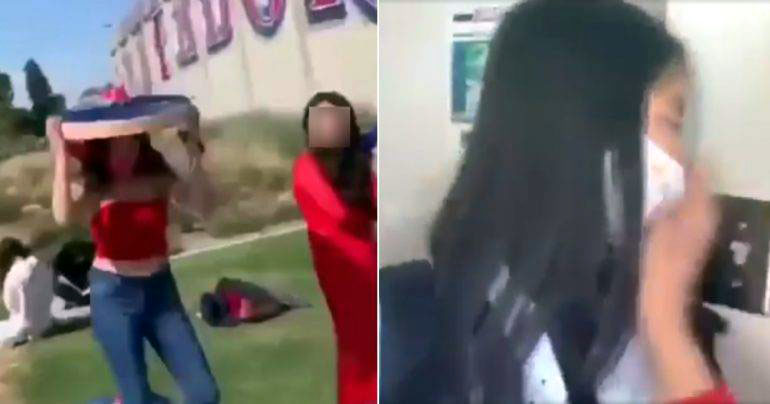 Trong video thứ ba, một trong hai nữ sinh đã tát vào mặt một nữ sinh gốc Á Châu đeo mặt nạ đề phòng dịch Covid-19.