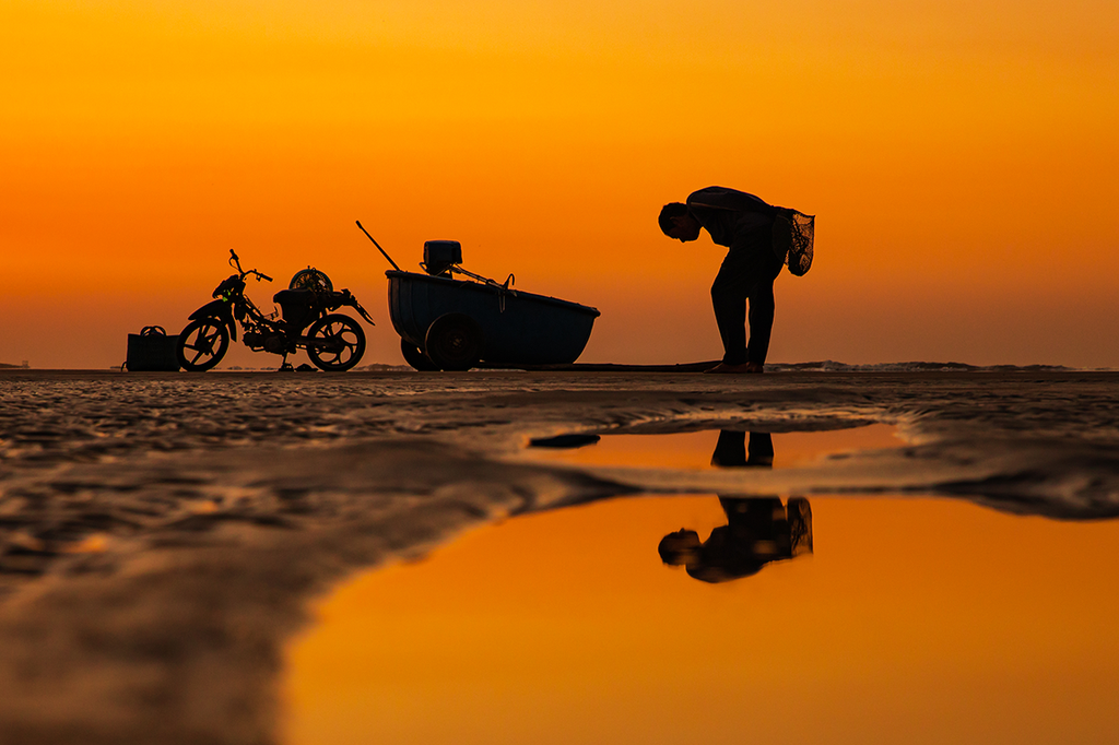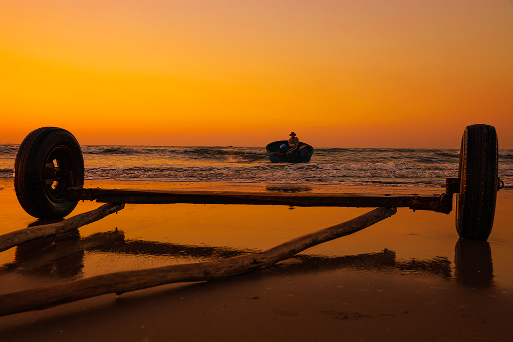 Khi những túi ngao đã đầy ắp, ngư dân lại chuẩn bị dóng thuyền thúng, bắt đầu công việc đánh bắt ngoài biển. Sự hòa quyện giữa màu vàng cam của nắng, ánh nâu từ cát tạo nên bức tranh Hồ Tràm sớm bình minh đẹp đến nao lòng. Cả không gian chìm đắm trong sắc màu huyền ảo, con người lúc này trông thật nhỏ bé giữa đất trời bao la.