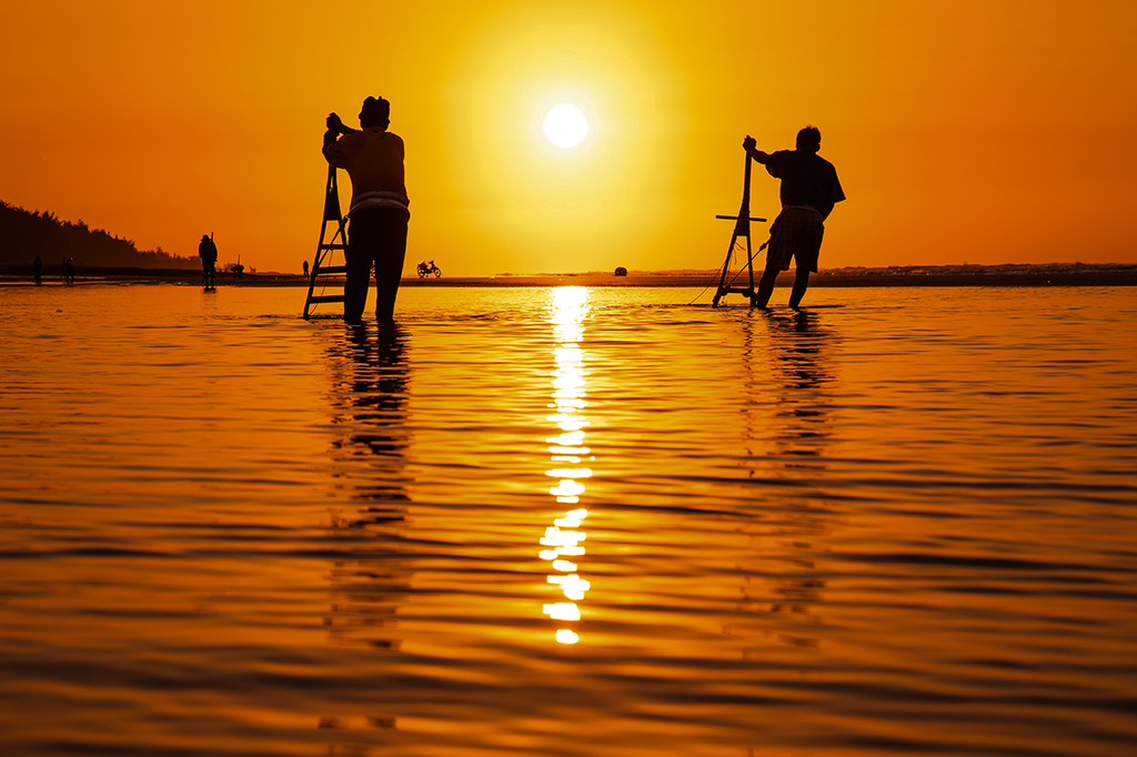 Những tia nắng đầu tiên xuất hiện cũng là lúc báo hiệu một ngày mới bắt đầu. Sáng sớm, người dân chài đã kéo thuyền thúng từ nhà đến dọc bãi biển, ngược xuôi hết cồn bãi này sang triền cát khác cho đến khi tìm được nơi có nhiều ngao nhất.