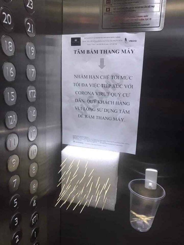 Khi bước vào trong thang máy của chung cư, cư dân sẽ được cung cấp những que tăm được gắn trên một tấm mút xốp tại vị trí gần nút bấm thang máy. Thay vì dùng tay, cư dân chỉ cần rút một que tăm để chọc vào nút bấm và sau đó bỏ vào ly nhựa được treo bên cạnh.