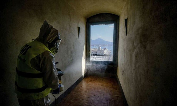 Nhân viên phun thuốc khử trùng bên trong một bảo tàng ở Naples, Italy hôm 10/3. Ảnh: AP.