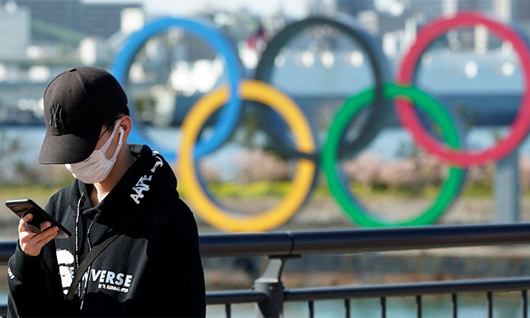 Du khách đeo khẩu trang bên biểu tượng của Thế vận hội mùa hè 2020 ở Tokyo, Nhật Bản hôm 3/3. Ảnh: AP.
