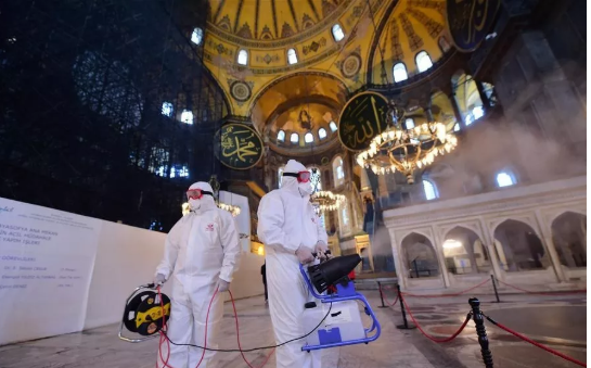 Các nhân viên tiến hành khử khuẩn tại một nhà thờ ở Istanbul, Thổ Nhĩ Kỳ (Ảnh: THX)