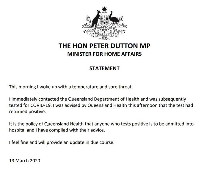 Cùng ngày 13/3, Bộ trưởng Bộ Nội vụ Australia Peter Dutton đã đăng tải một tuyên bố trên mạng xã hội nói rằng ông bị sốt và đau họng khi thức dậy vào sáng sớm; sau đó liên lạc với Bộ Y tế bang Queensland để xét nghiệm virus Corona chủng mới và kết quả có được vào buổi chiều cho thấy ông đã bị nhiễm COVID-19.
